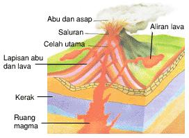 Gunung berapi terbentuk ketika suatu lubang atau celah di dalam kerak bumi mengakibatkan magma terdorong keluar melaluinya. Apa sih magma itu ? Magma merupakan batuan cair. Magma yang sudah terdapat dipermukaan disebut lava. Sedangkan lava adalah lahar yang mengalir ke bawah dan sangat panas.
